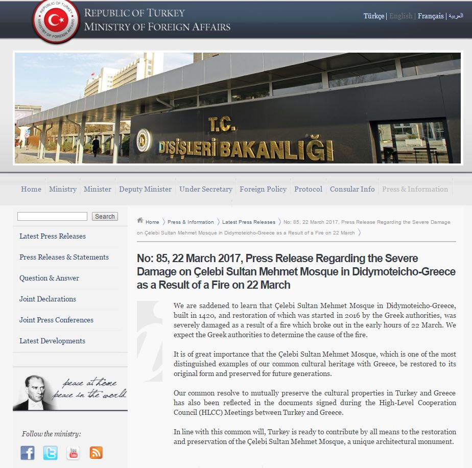 "We expect the Greek authorities to determine the cause of the fire," said the Turkish Foreign Ministry in a statement on the Bayezid Mosque in Didymoticho.