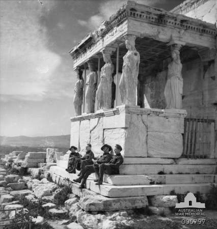 It depicts Australian soldiers enjoying a brief period of leave in Athens before they made there way up to northern Greece to face the coming German invasion, shoulder to shoulder with their Greek and other Allied comrades. The photo (AWM ref 006797) and depicts some diggers visiting the Acropolis.